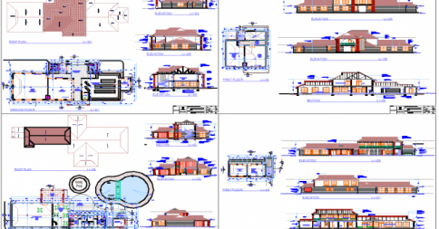This Clubhouse AutoCAD DWG drawing presents a complete architectural layout with 2D plans, detailed sections, and rendered elevations designed for modern recreational and residential projects. The drawing includes floor plans with dimensions, room layouts, furniture arrangements, and material detailing. It also provides elevation and sectional drawings showcasing façade treatment, roof profiles, and structural relationships, ensuring a precise understanding of both spatial and aesthetic design elements. The inclusion of swimming pool layouts, verandah details, and entry designs enhances the practicality of the plan for real-world applications.
