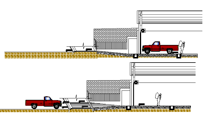 Vegetables storage house architecture project that includes front elevation with loading truck, passing nivel, road, human block, roof view, wall design and much more of vegetable storage house details.