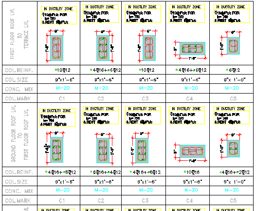 Full constructive details of column schedule of work shop that includes column reinforcement, column size, concrete mix, column mark, plinth level to ground floor roof, ground floor roof level to first floor roof, first floor roof level to terrace level and much more of full column details.