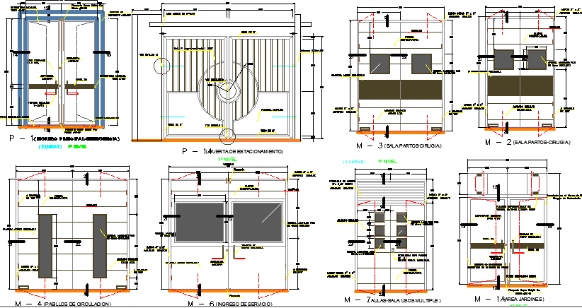 Door plan construction details that includes door frame, wooden frame, main entry door, consultant office door, hall door view, x-ray room door view, toilets doors view and much more of door construction of hospital.