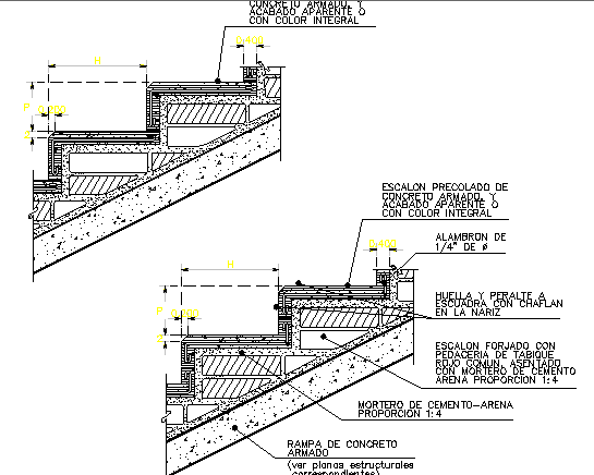 Stairway section details that includes pre-colored arm concrete scale, and apparent finish or integral color, wire, cement arena mortor proportion, ramp of armed concrete and much more of staircase details.