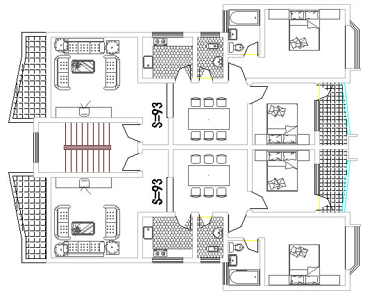Multi-family housing apartment architecture layout plan that includes a detailed view of main entry door, family hall, living room, indoor furniture details, kitchen, dining area, balcony, wash area, bedrooms, terrace and much more of housing layout plan.