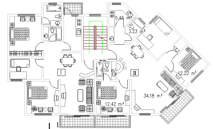 One family housing architecture layout plan that includes main entry gate with staircase view, family hall, living room, kitchen, dining area, balcony, wash area, bedrooms, terrace and much more of housing layout plan.