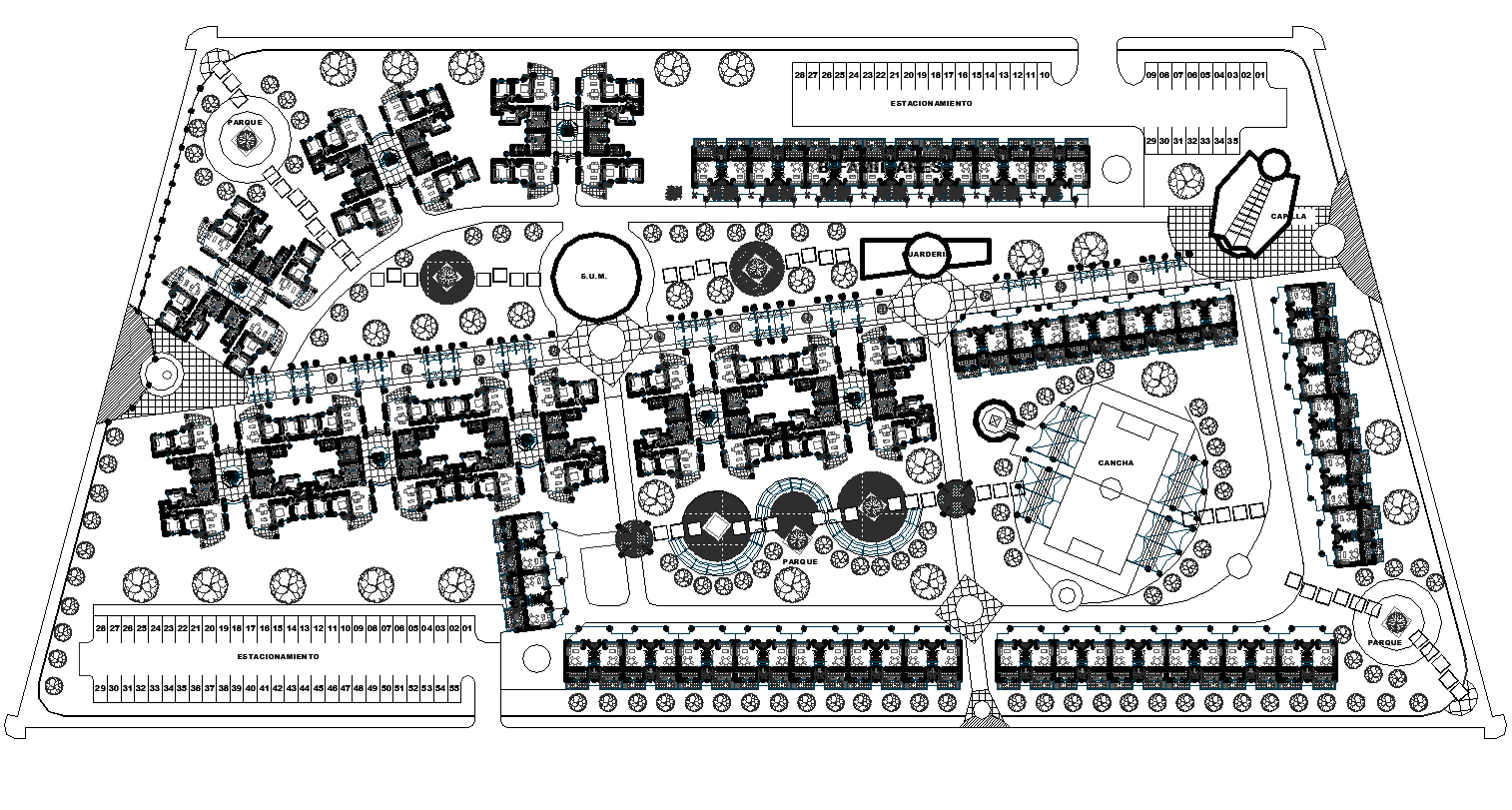 the architecture layout plan and top view of luxurious residential apartment with club house, sports ground and much more detailing in autocad format.