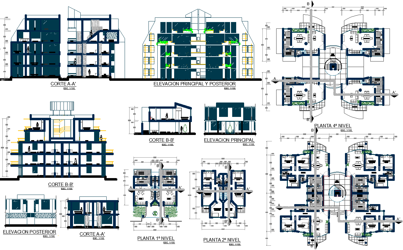 the architecture layout plan of 2 and bedrooms apartment along with furniture detailing, section plan and elevation design of Residential Apartment Project.