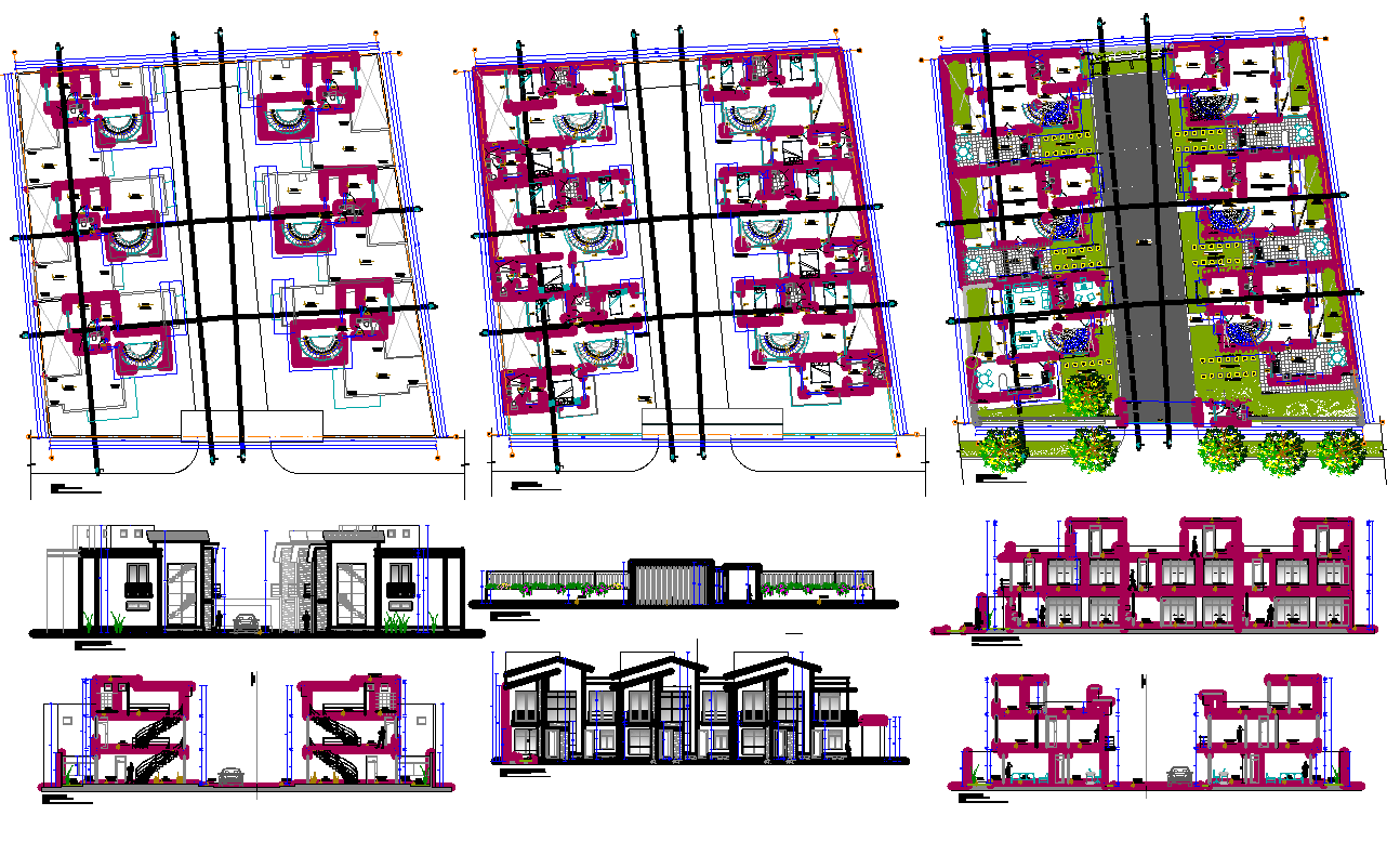 the architecture layout plan of ground floor and first floor plan along with furniture detailing, section and elevation design also have township out side elevation design