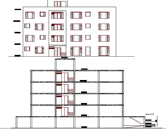 Residential apartment building elevation and section details that includes a detailed view of front elevation, section plan with doors and windows, roof, balcony, floor view, staircase, tree view and much more of elevation and section plan.