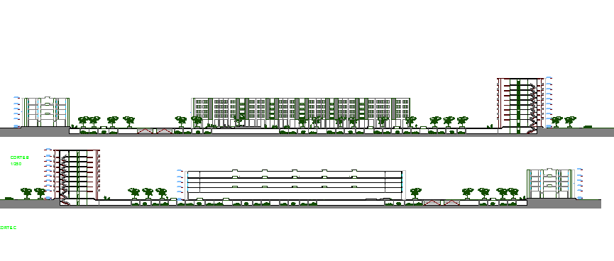 Main full elevation of multi-family housing building dwg file.