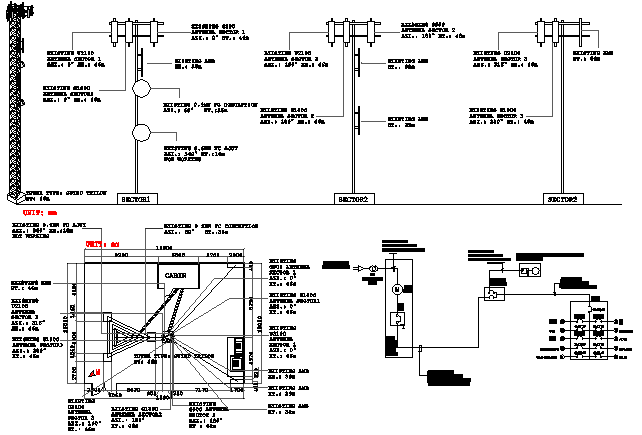 Detailing architecture project of electric tower that includes fuel tank, gfn set house, fuel tank, existing ports numbers, sectors and meters, three legged tower view with leg detailing, control room office and much more of tower project.