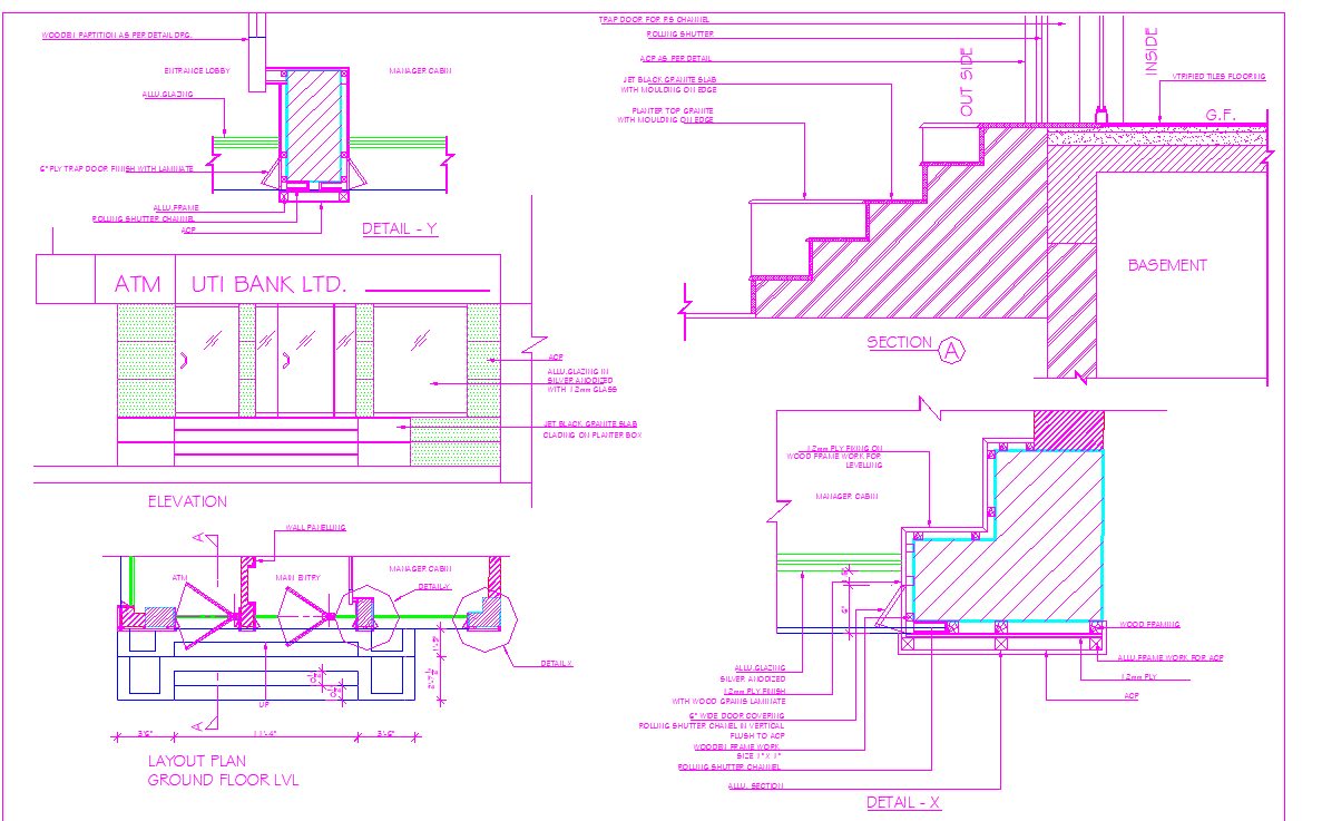 Bank Project detail dwg file. find here layout plan of the ground floor plan, section plan and elevation design of bank project detail view in 2d cad format.