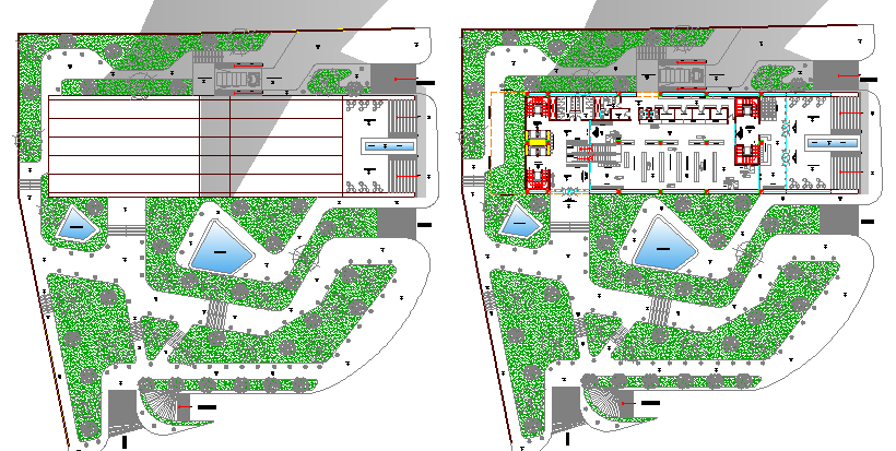Landscaping and site plan of corporate office building dwg file.