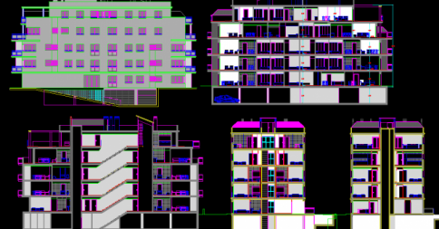 This Residential Apartment CAD Drawing provides a detailed 2D AutoCAD DWG layout featuring elevation and sectional views of a multi-storey apartment building. The drawing showcases complete floor levels, wall thicknesses, and room divisions, accurately representing the architectural and structural composition of the residential complex. Each section is drawn to scale, displaying the vertical and horizontal alignment of the floors, window openings, staircases, and slab thickness. The elevation view reflects façade treatments, window arrangements, and floor proportions for architectural clarity.