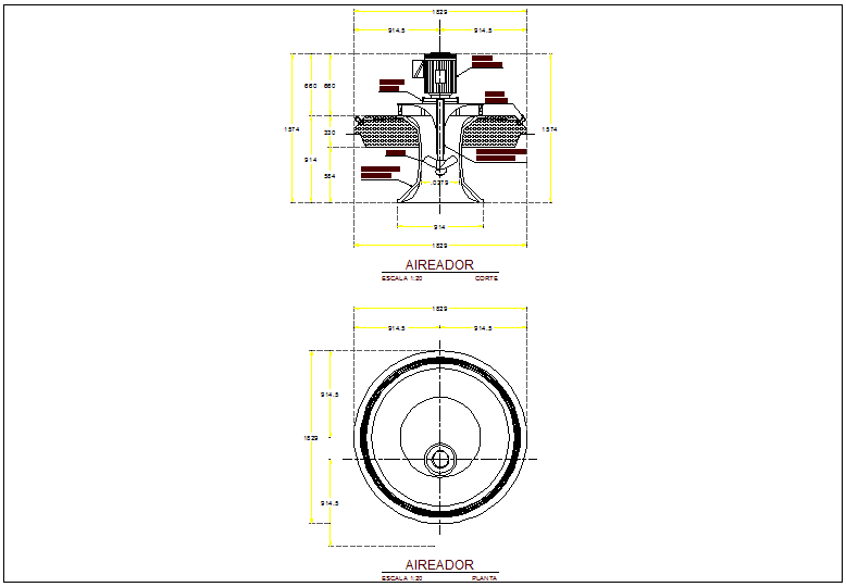 Pumping aerator plan and elevation view dwg file in elevation view with electric motor and eye of mooring aerator,helix and throat of flotation and main body view with casing and plan view with necessary detail.