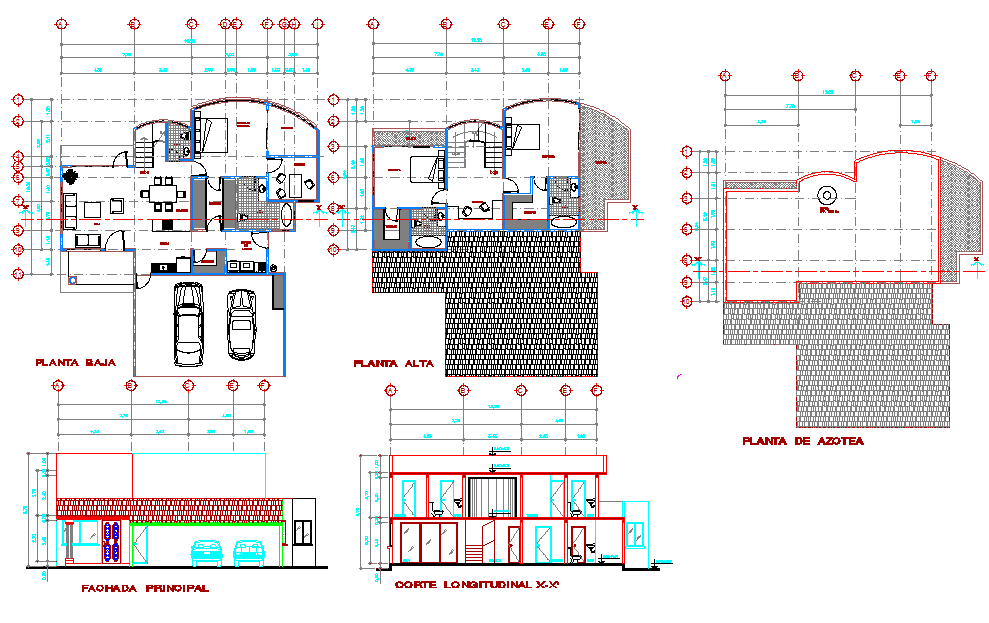 This Bungalow's Design CAD Drawing features a detailed 2D AutoCAD DWG layout including floor plans, sectional views, and front elevation details. The drawing illustrates the ground floor (planta baja), first floor (planta alta), and roof layout (planta de azotea) with accurate dimensioning and spatial arrangements. It also provides a longitudinal section (corte longitudinal) and main façade elevation (fachada principal), showing height levels, structural alignment, and architectural proportions. Each area, from bedrooms and living rooms to garages and terraces, is carefully designed to ensure a practical and aesthetically pleasing layout for residential projects.