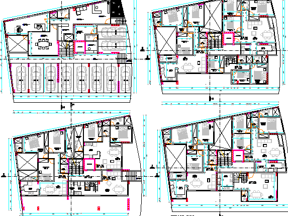 Multi-family residential building floor plan details that includes ground floor with basement car parking view, first floor, second floor, top floor with family hall, main entry door, kitchen, dining area, living area, bedroom, master bedroom, wash area and much more of house floor plan.