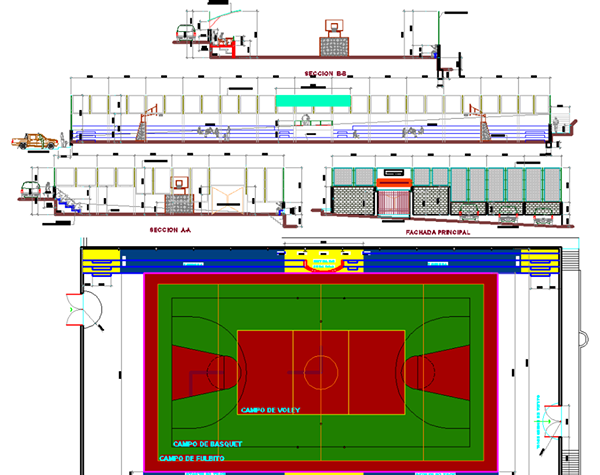 This Basketball Project CAD Drawing provides a detailed 2D AutoCAD DWG layout displaying a complete sports court design with floor plans, sections, and elevation views. The plan includes precise dimensions for basketball, volleyball, and football courts with clear field markings and seating layouts. The AA and BB sections illustrate the internal structure, audience stands, and building arrangement, while the main elevation highlights the exterior façade with proportioned detailing and height levels. The design ensures proper circulation, visibility, and functionality within the sports facility.