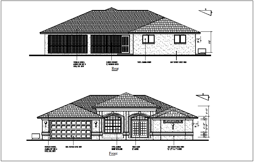 Bungalows rear and front view dwg file in rear view door,window and floor view and tile view and front view with main entrance view and door and window view and triangle shaped view in front with necessary dimension.