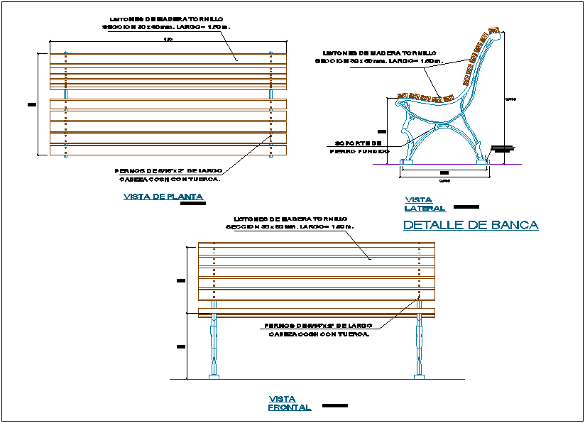 Outdoor wooden seating bench detail dwg file, Outside wooden seating bench detail with elevation and side elevation view and plan view bench