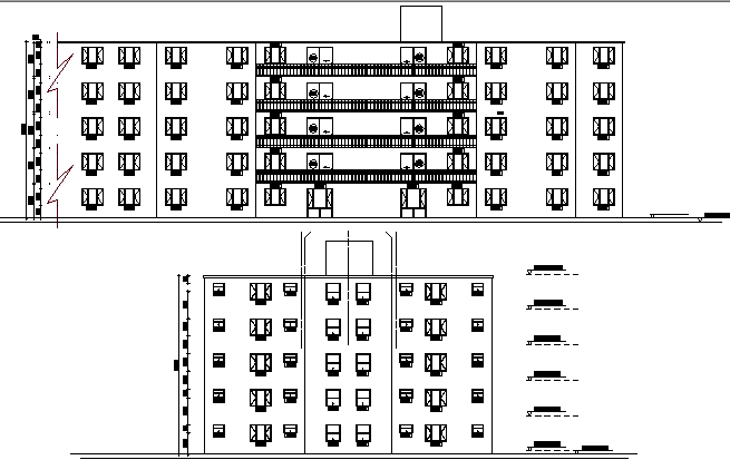 Front and back elevation of Multi-flooring residential building that includes a detailed view of front elevation, back elevation, doors and window view, staircase view, floor view, roof view and much more of building elevation.
