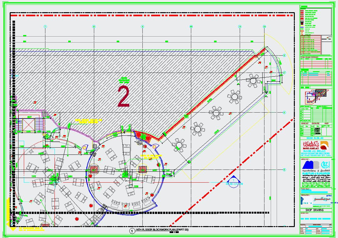 find here 14th floor of restaurant layout plan along with furniture detailing includes dining area and counter detailing in dwg file.