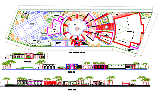 This Residential Tourism Project CAD Drawing presents a well-detailed 2D AutoCAD DWG layout featuring the architectural plan, section views, and elevations of a luxury tourism and housing complex. The layout includes recreational spaces, residential units, landscape areas, and a tennis court, all arranged around a circular central hub. The elevation drawings display exterior façade elements with aesthetic palm tree landscaping, façade detailing, and proportioned architectural features. Each section is meticulously dimensioned to ensure structural precision and construction clarity.