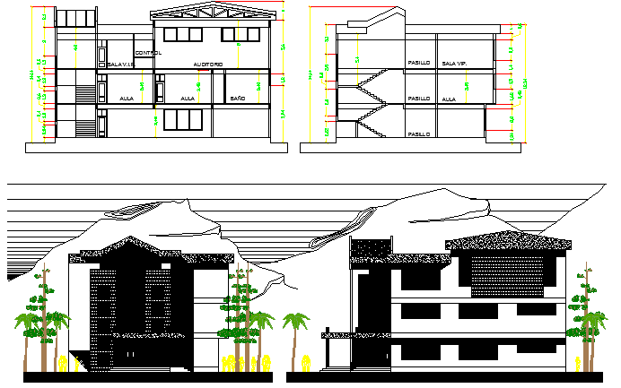 Five story school building elevation and section plan that includes a detailed view of front elevation, back elevation, front section, back section with door and window view, staircase view, floor view, roof or terrace view, tree view, classrooms, toilets and much more of school design.