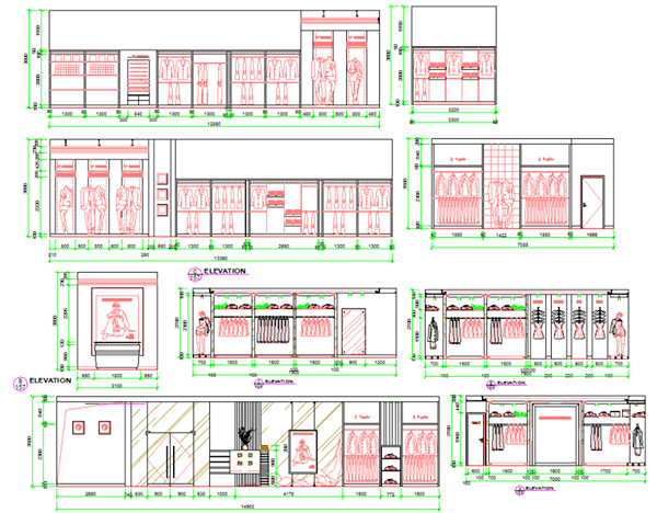 Clothing Store 2D CAD Drawing with Wall Elevations and Sections