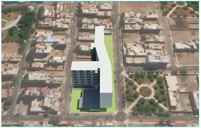 3d design of multi-flooring college that includes detailed top view of college with landscaping, terrace view, door and window view, balcony view, car parking view and much more of college design.