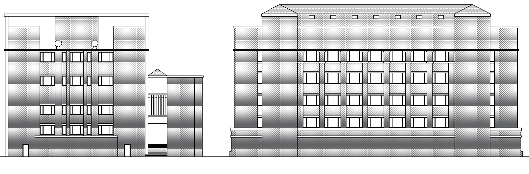 Corporate building main and side elevation that includes front elevation, side elevation, doors and window elevation, staircase elevation, floor view, balcony view, wall design and much more of corporate building elevation.