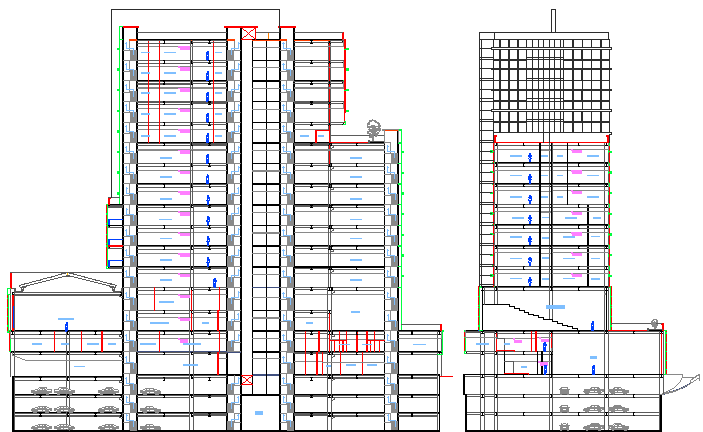 Multi-flooring corporate office building section details that includes floor view, doors and window view, column and beam view, balcony view, staircase view and much more of section details.