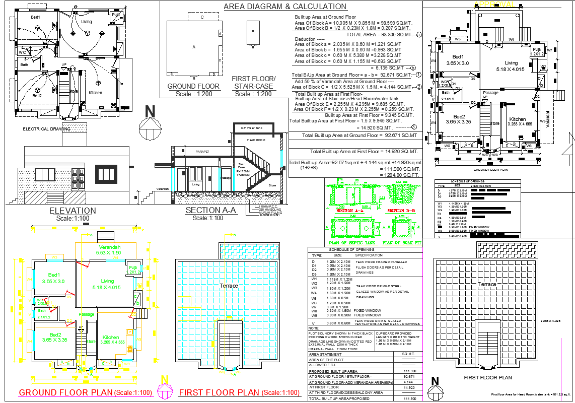 ground floor layout plan, terrace floor plan, electrical installation plan, section plan, elevation design, area digram and calculation of this house project detai view.