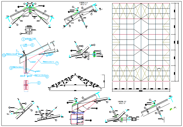 Steel structure of roof detail dwg file, Steel structure of roof detail and structure member Section view and roof elevation and side elevation view detail, truss and king & column strut connection view of roof detail