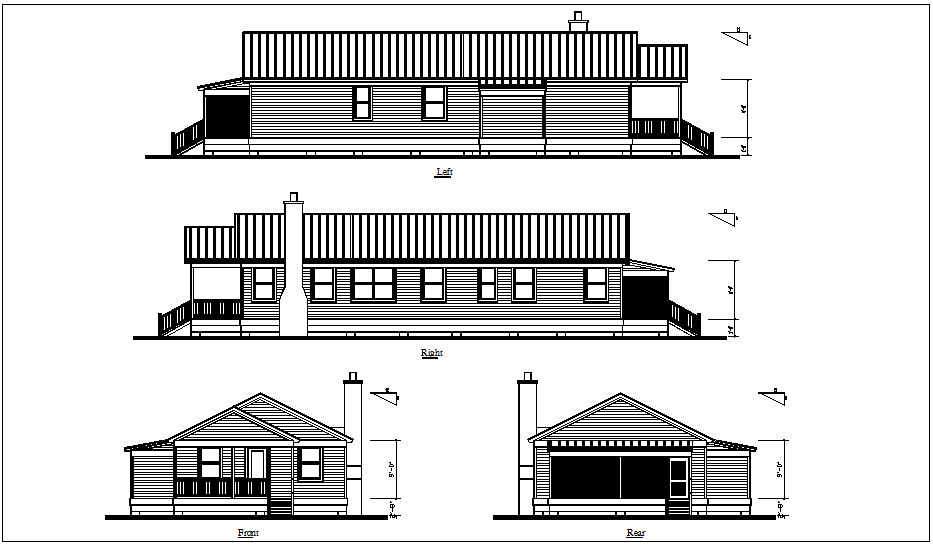 Left,right,front and rear view of bungalows dwg file