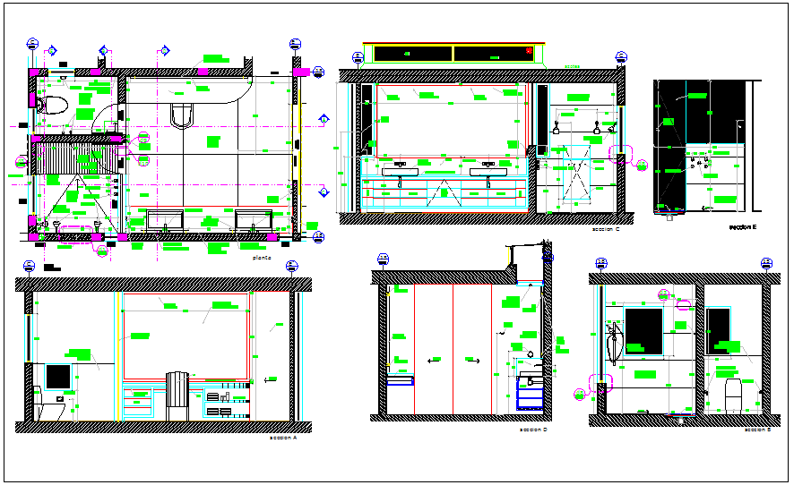 Office washroom plan detail dwg file, Office washroom plan detail and design plan layout plan detail information view, elevation and side elevation view detail, toilet cupboard section and elevation view, wash basin and sink plan and elevation view detail