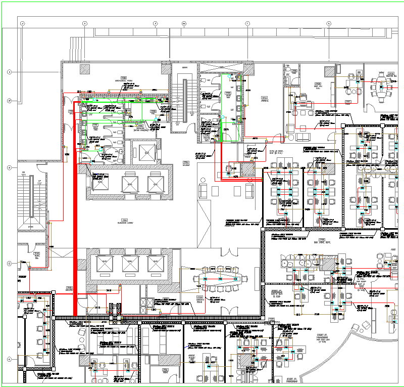 The architecture layout plan along with furniture detail includes 6 lift detail, bathroom, reception lounge, meeting room, work station, and much more detailing.