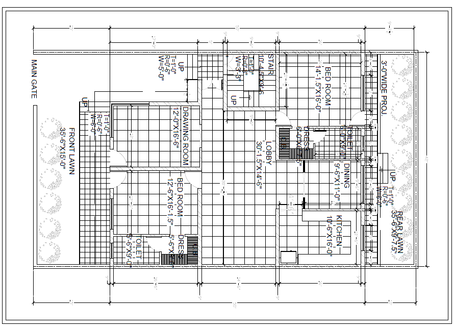 House Layout plan dwg file. The architecture layout plan includes 2 bedroom, kitchen, drawing room, lobby, dining area, stair, front and rear lawn with dimension detail