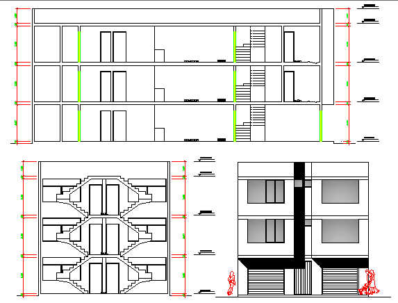 Multi-flooring and multi-family housing building elevation and section details dwg file.