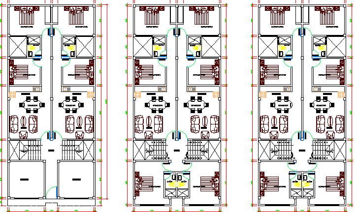Ground, first and second floor plan layout of housing building dwg file
