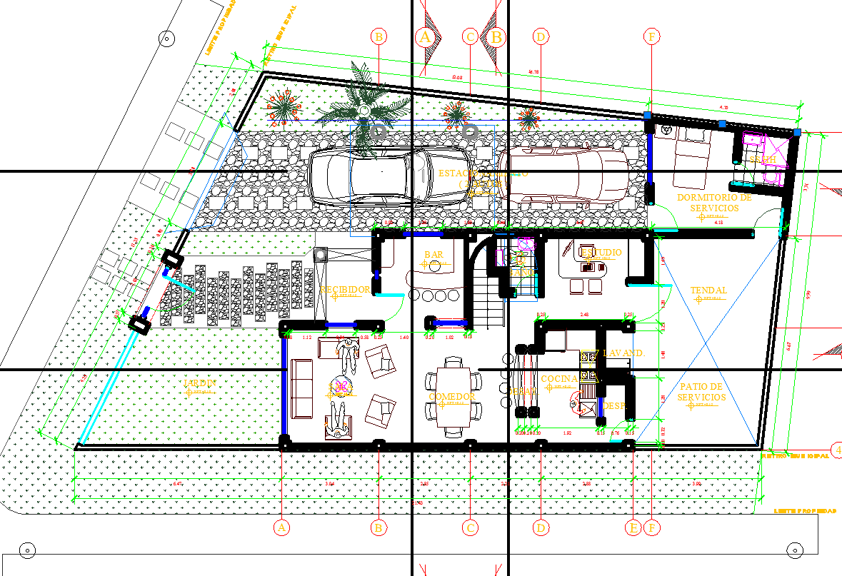 the architecture layout plan along with furniture plan includes bar, drawing room, kitchen, study room, master bedroom, vehicle parking, and landscaping design.