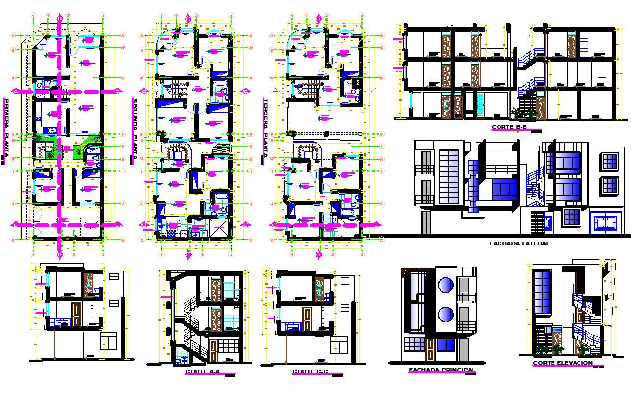the architecture layout plan, structure plan, section plan, construction plan, and elevation design of Multifamily Residence project.
