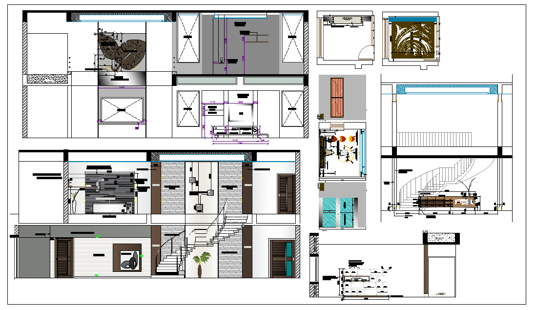 Residential housing plan layout detail dwg file, Residential housing plan layout detail with interor elevation view of furniture,semi spiral stair section view, semi spiral stair plan layout view, elevation of door and window, interior furniture of living room