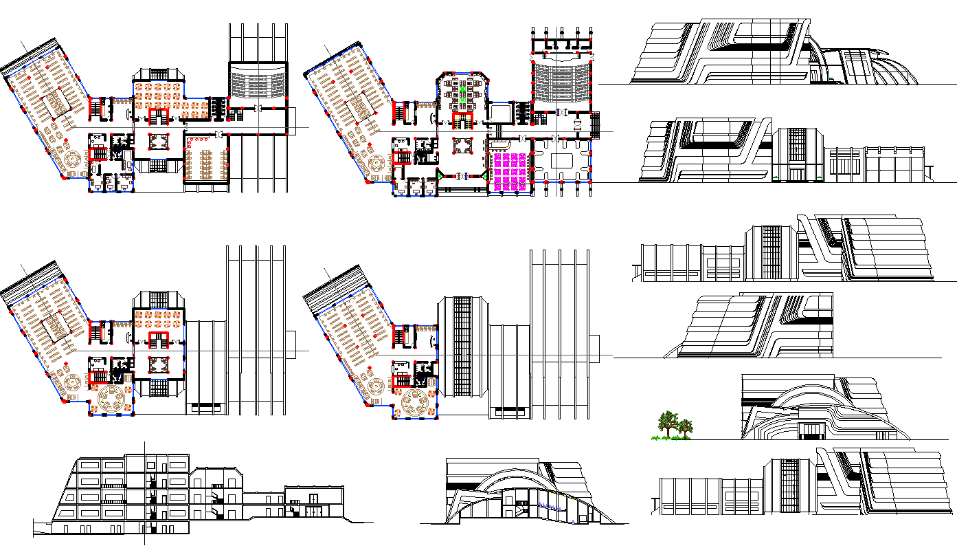 the architecture layout plan of all floor level along with furniture detailing, and elevation design of the library project in cad file.