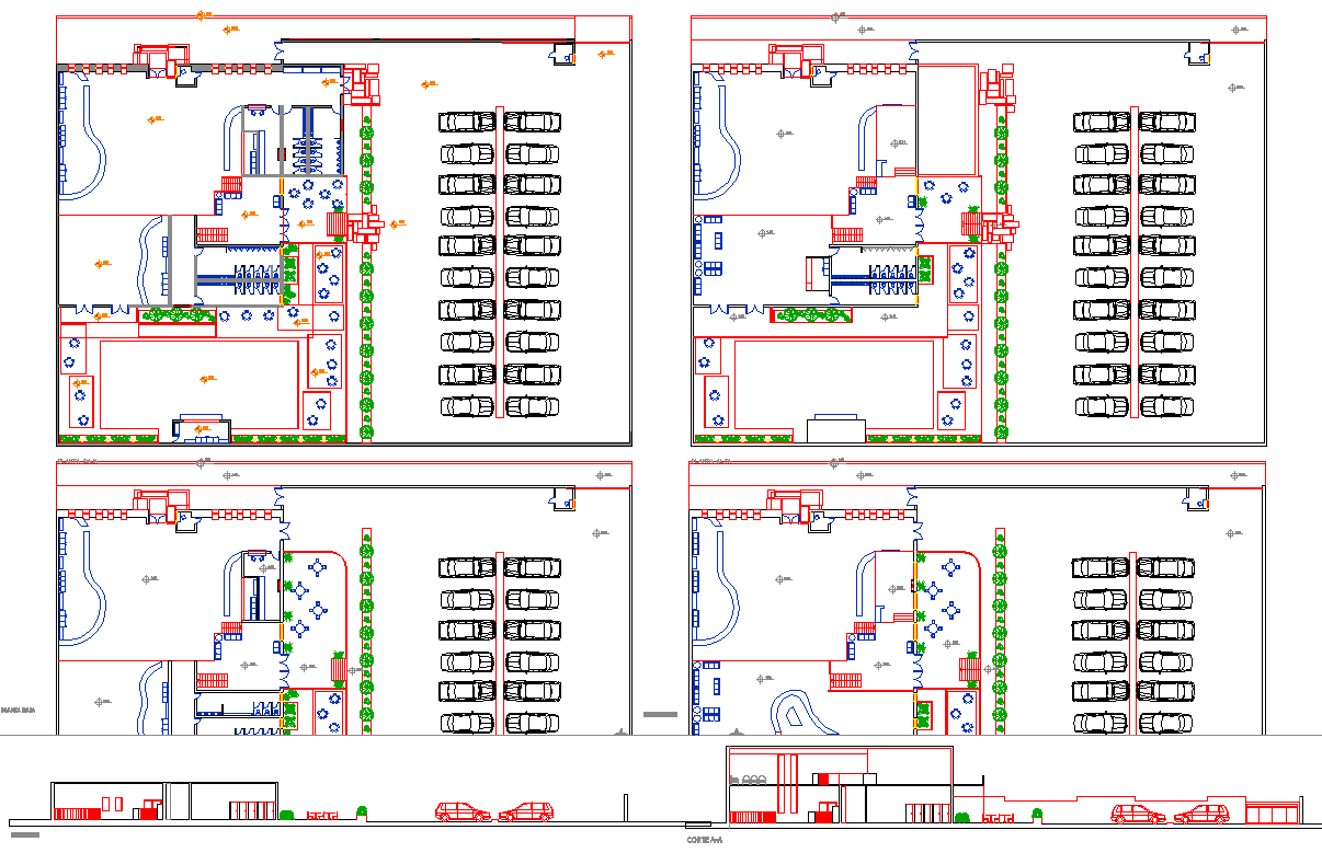 the architecture layout plan of all floor level includes a parking area, structure plan, restaurant, landscaping design and much more detailing in cad file.
