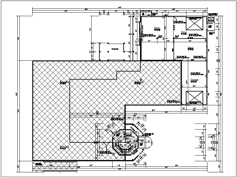Commercial structure plan layout detail dwg file, Commercial structure plan layout detail with dimension detail, shop plan view, semi spiral plan view detail, foyer passage plan view, electrical layout detail view etc