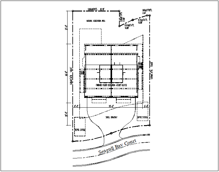 Building plan layout view of detail dwg file, Building plan layout view of detail with dimension, septic system, shell driveway, foundation of column spacing detail etc