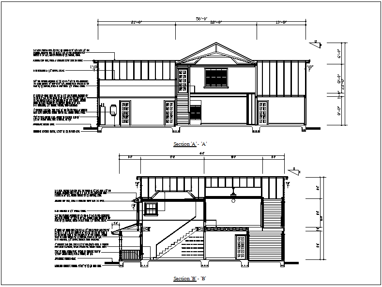 Section and side section view of house detail view dwg file, Section and side section view of house detail view with specification detail, concrete floor and column bars detail view and information, truss detail, plywood flooring detail, ceiling insulation detail
