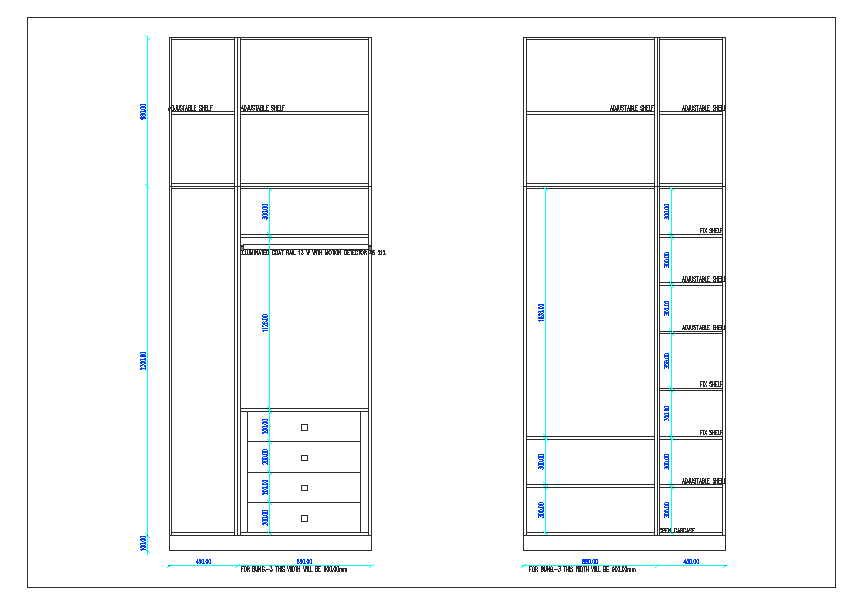 cabinet of bed room dwg file, interior elevation view of wardrobe and dimension detail