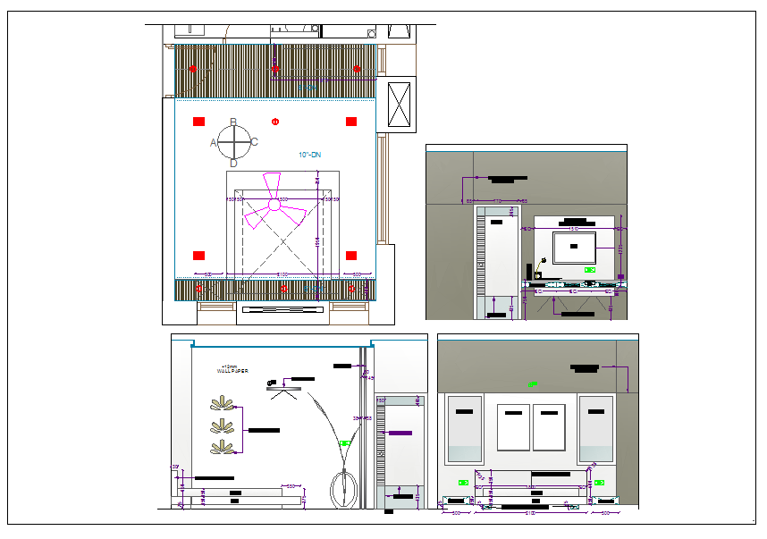 Bed room plan and elevation view detail dwg file, Bed room plan and elevation view of interior wall & elevation of furniture, TV cabinet, wardrobe, drawer