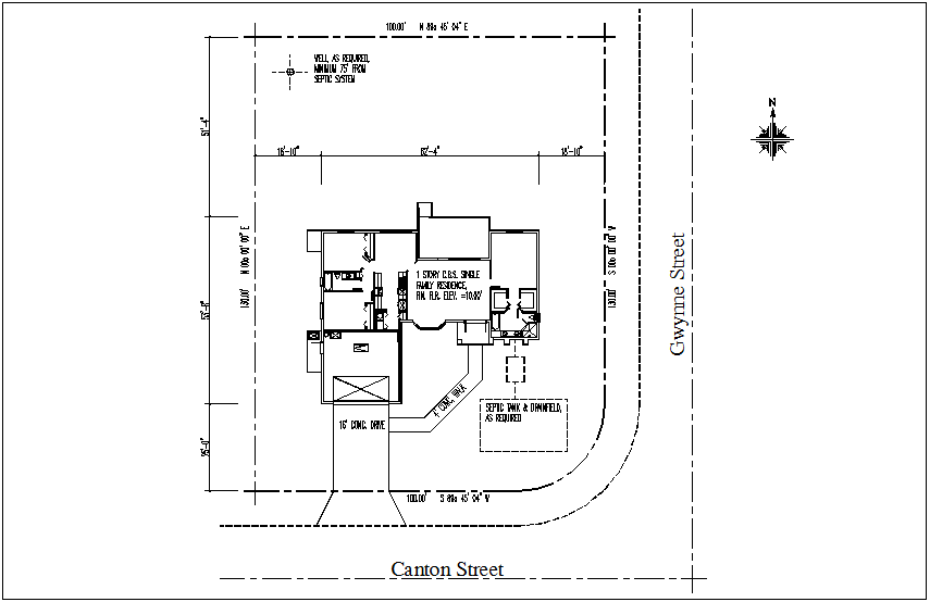 Plot area building line and road line details dwg file, Plot area building line and road line details in the dimension details, hidden line in plot boundary and north arrow dwg file, Bungalow plan in details of the bedroom, toilet, kitchen, washroom etc, with dimension details