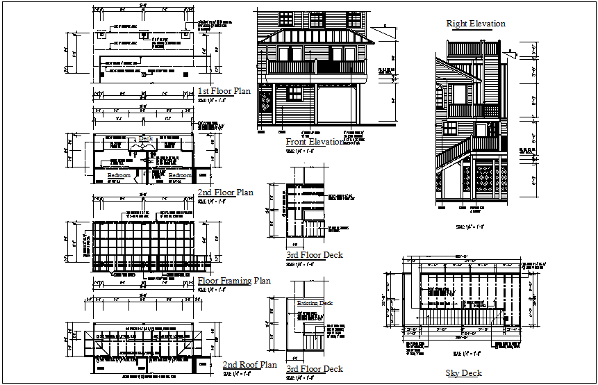 Bungalow plan view details dwg files, Bungalow plan view elevation, and side elevation 1st-floor plan detail and dimension details, 2nd-floor plan details and dimension, floor framing plan in details, 2nd roof plan details, 3rd-floor deck elevation plan details and section details